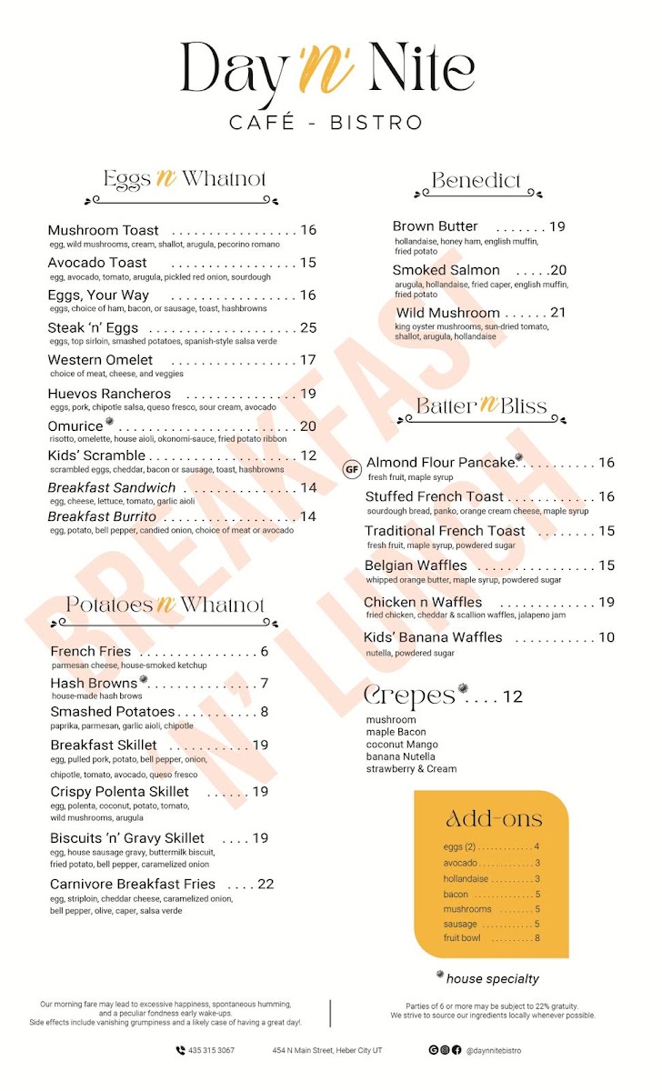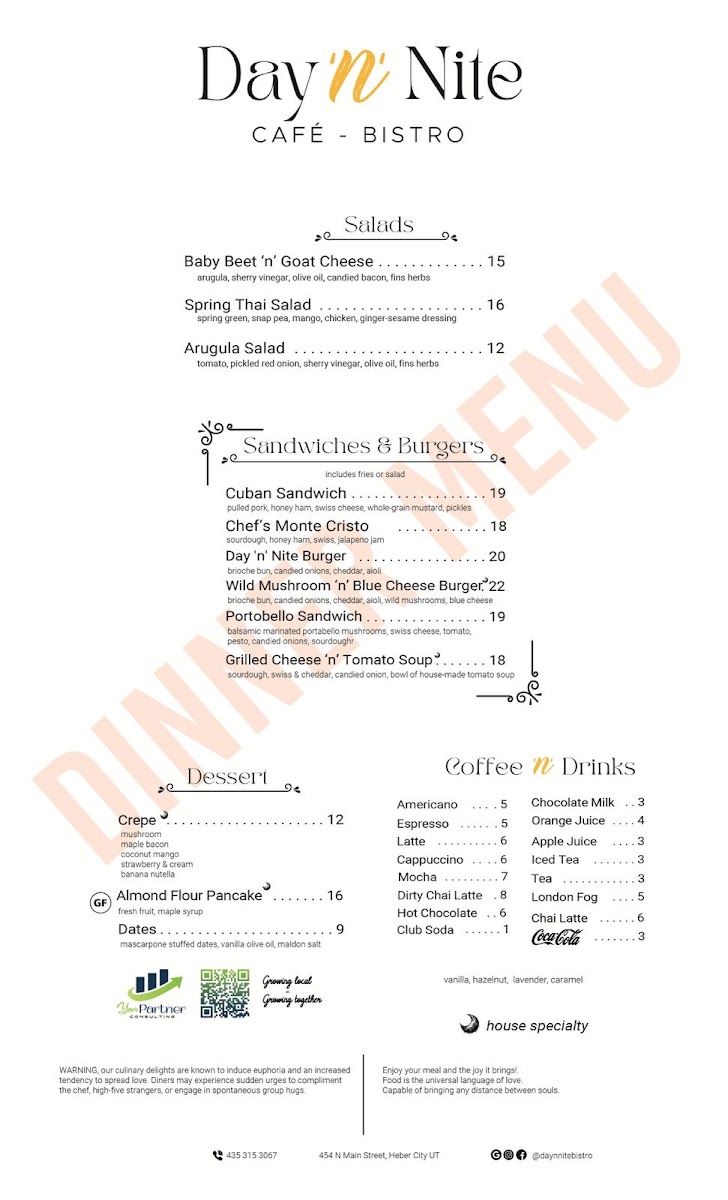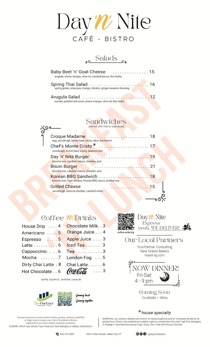 Welcome to Day n Nite Cafe-Bistro, a hidden gem nestled in the heart of Heber City, Utah. This vibrant café blends comfort and culinary creativity, offering an enticing menu that pries open the palate.